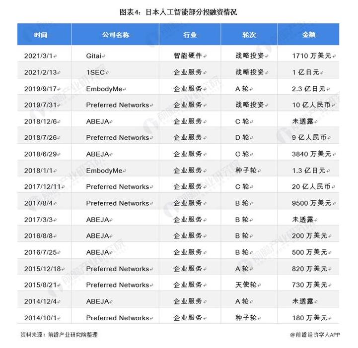 日本人工智能市場的投資規模遠不如美國、歐洲和中國等國家和地區,其中日本人工智能企業數量較少也是其中影響因素。